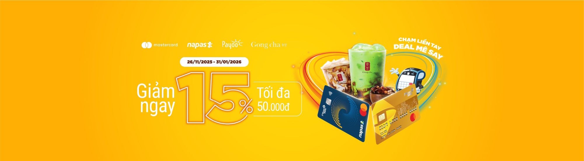 Khách hàng nhận ưu đãi giảm ngay 15% tối đa 50.000 VNĐ cho đơn từ 60.000 VND khi CHẠM ĐỂ THANH TOÁN bằng thẻ Contactless Mastercard® hoặc Napas trên Payoo POS tại các cửa hàng Gongcha.