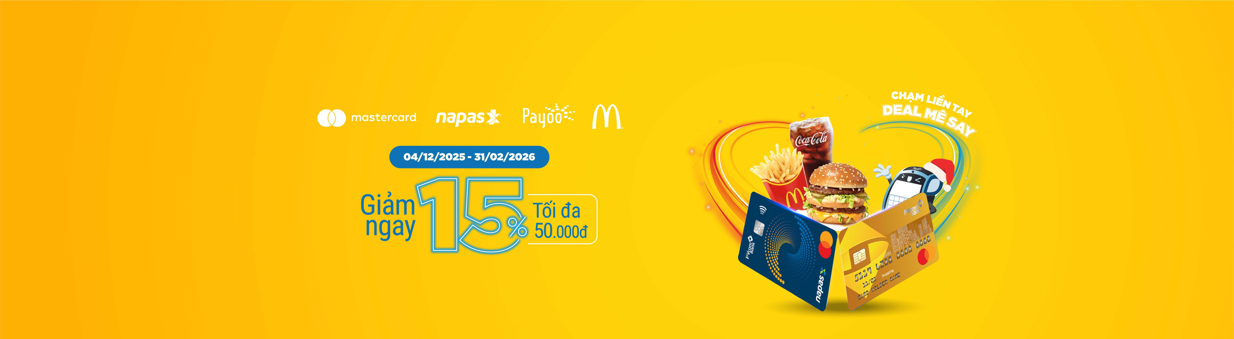Giảm ngay 15%, tối đa 50.000 VND cho đơn từ 50.000 VND khi chạm để thanh toán bằng thẻ Contactless NAPAS hoặc Mastercard trên Payoo POS tại các cửa hàng Mc Donald’s.