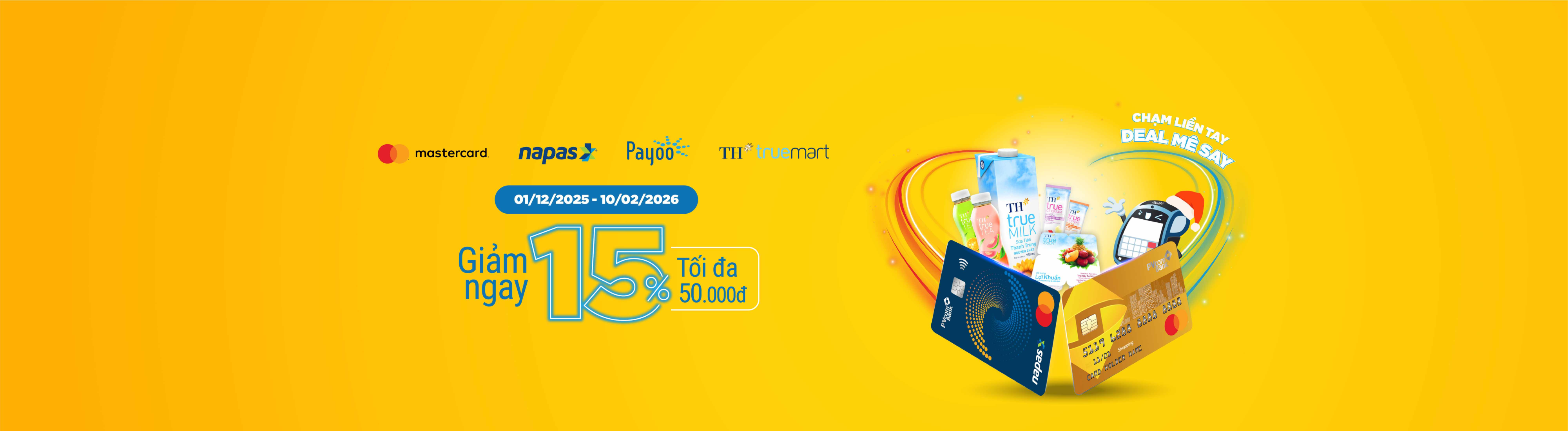 - Giảm ngay 15%, tối đa 50.000 VND cho đơn từ 200.000 VND khi chạm để thanh toán bằng thẻ Contactless NAPAS hoặc Mastercard trên Payoo POS tại các cửa hàng TH true mart.