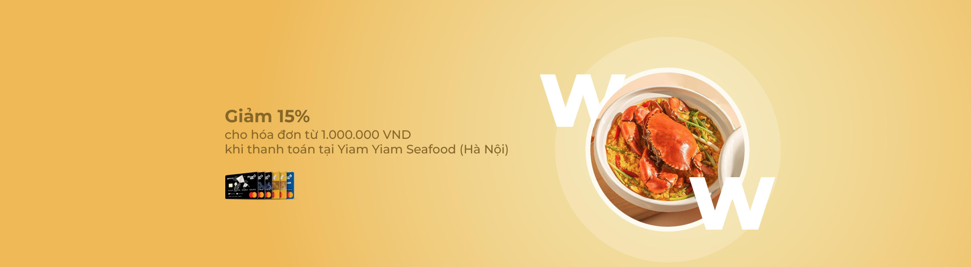 - Giảm 15% cho hóa đơn từ 1.000.000 VND khi thanh toán tại Yiam Yiam Seafood (Hà Nội).