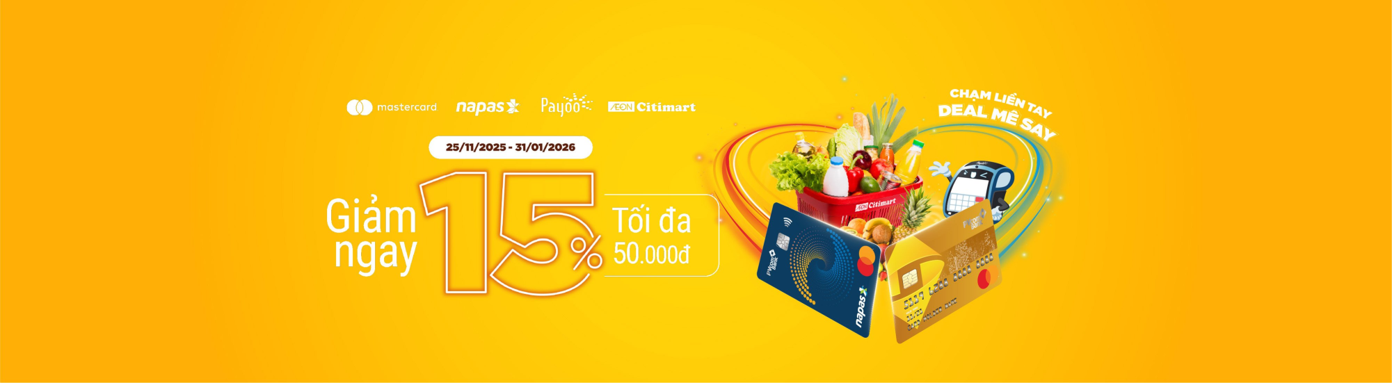 Khách hàng nhận ưu đãi giảm ngay 15% tối đa 50.000 VNĐ cho đơn từ 100.000 VND khi CHẠM ĐỂ THANH TOÁN bằng thẻ Contactless Mastercard® hoặc Napas trên Payoo POS tại các cửa hàng Aeon Citimart.