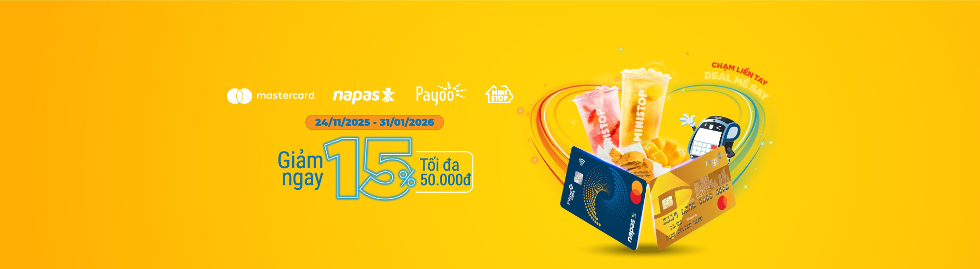 Giảm ngay 15% tối đa 50.000 VNĐ cho đơn từ 50.000 VNĐ khi CHẠM ĐỂ THANH TOÁN bằng thẻ Contactless Mastercard® hoặc Napas trên Payoo POS tại cửa hàng Ministop.