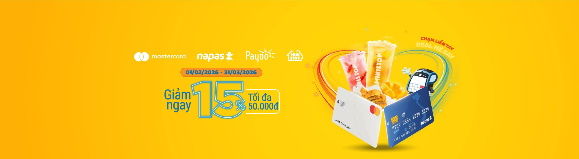 Giảm ngay 15% tối đa 50.000 VNĐ cho đơn từ 50.000 VNĐ khi CHẠM ĐỂ THANH TOÁN bằng thẻ PVcomBank Mastercard® hoặc PVcomBank Napas trên Payoo POS tại cửa hàng Ministop.