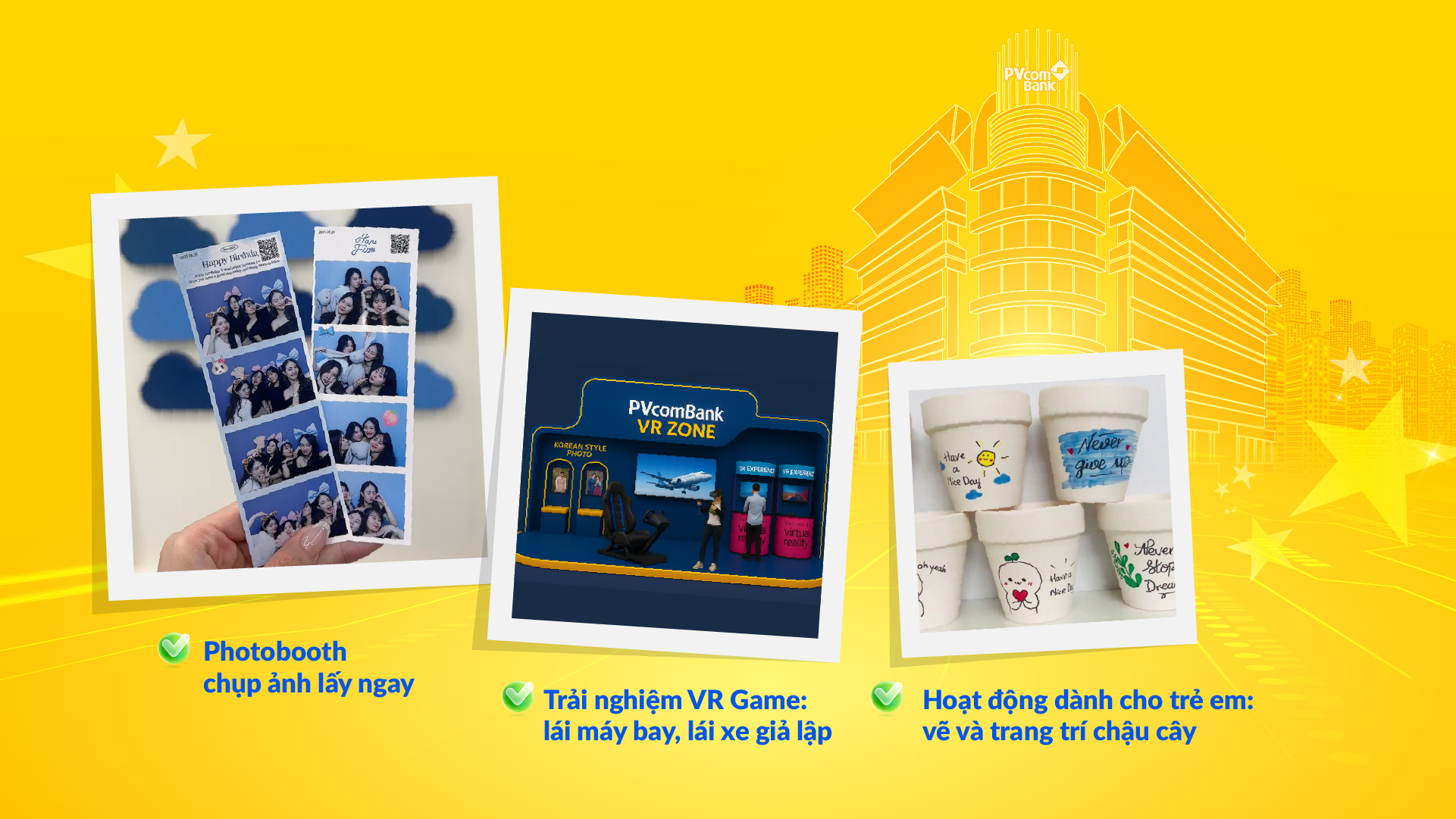 Một trong những điểm nhấn nổi bật của Ngày hội Văn hóa năm nay chính là hoạt động gian hàng trải nghiệm “Bản sắc PVcomBank” - được thiết kế bởi Ban tổ chức và 09 Liên quân, hứa hẹn sẽ mang đến cho những người tham gia chương trình nhiều khoảnh khắc đáng nhớ thông qua các hoạt động thú vị như: chụp ảnh photobooth lấy ngay, trải nghiệm trò chơi thực tế ảo (VR Game), trồng cây/trang trí chậu cây… Đặc biệt, ngoài những phần quà hấp dẫn tại sự kiện (balo dây rút, quạt mini cầm tay…), các CBNV PVcomBank còn có cơ hội trúng thưởng xe máy điện VinFast Evo Lite Neo - hiện đại và thân thiện với môi trường.