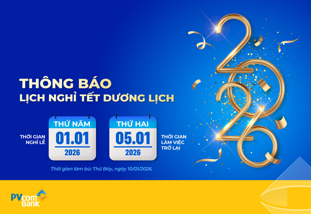Ngân hàng TMCP Đại Chúng Việt Nam (PVcomBank) trân trọng thông báo tới Quý Khách hàng lịch nghỉ Tết Dương lịch năm 2026 như sau: