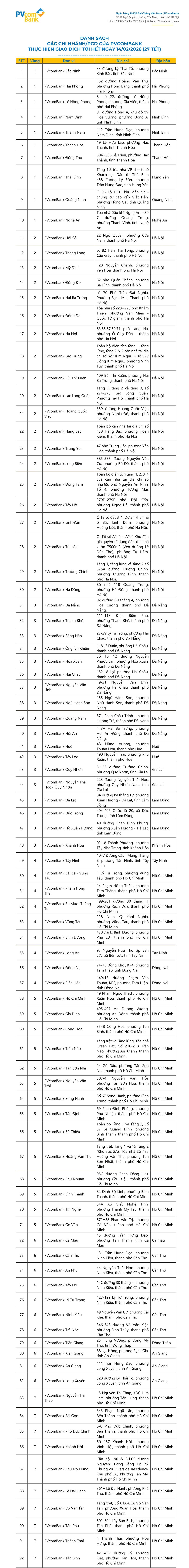 Danh sách các CN/PGD thực hiện giao dịch tới hết thứ Bảy ngày 14/02/2026 (tức 27 Tết), cụ thể như sau: