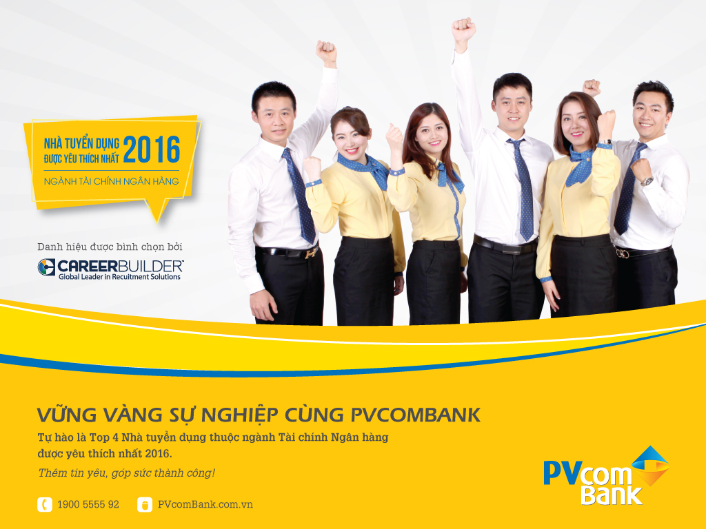 Mạng việc làm và Tuyển dụng lớn nhất thế giới CareerBuilder vừa công bố Danh sách 100 Nhà tuyển dụng được yêu thích nhất 2016 tại Việt Nam. Trong đó, Ngân hàng TMCP Đại chúng Việt Nam (PVcomBank) nằm trong Top 4 nhà tuyển dụng được yêu thích ngành Tài chính Ngân hàng 2016.